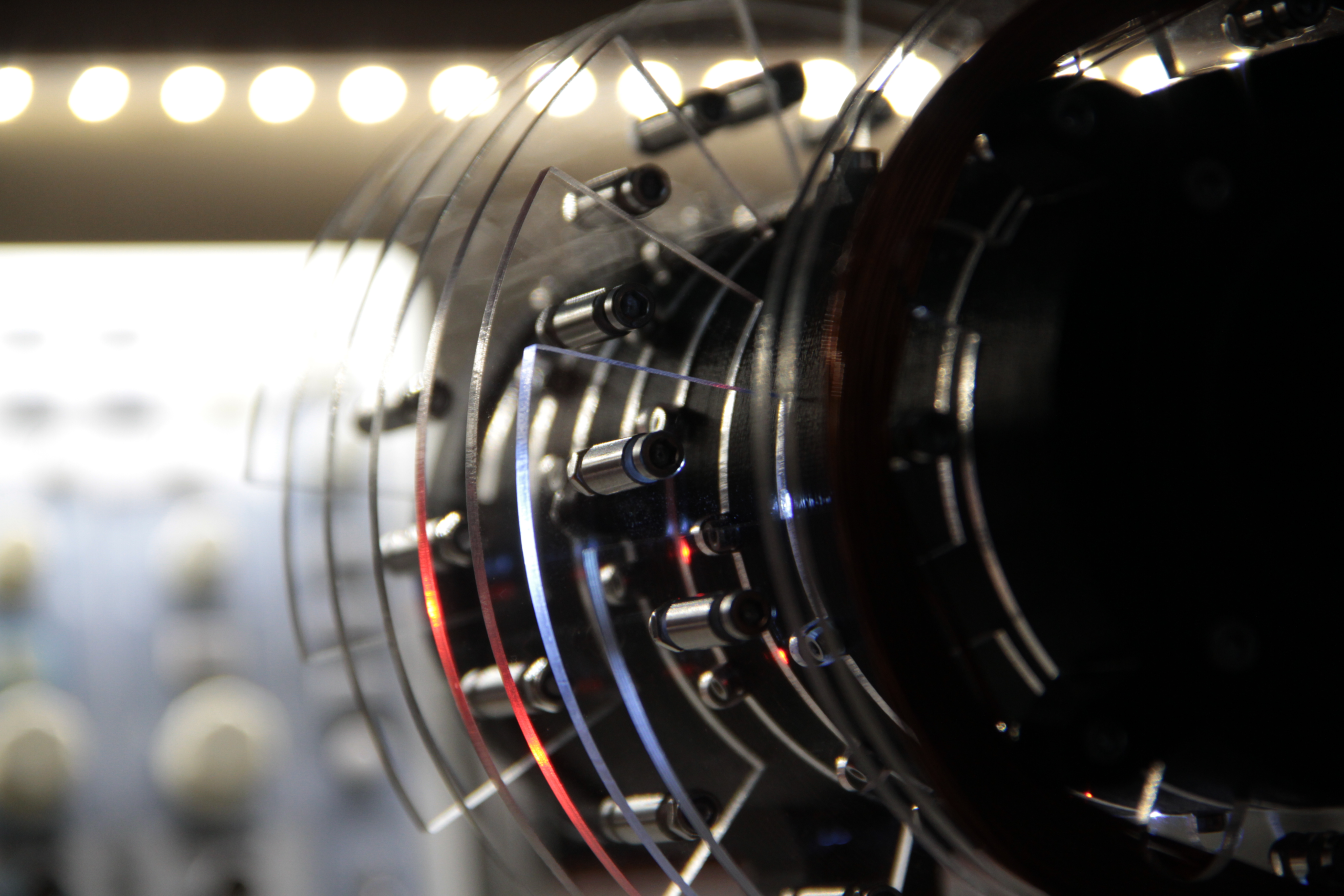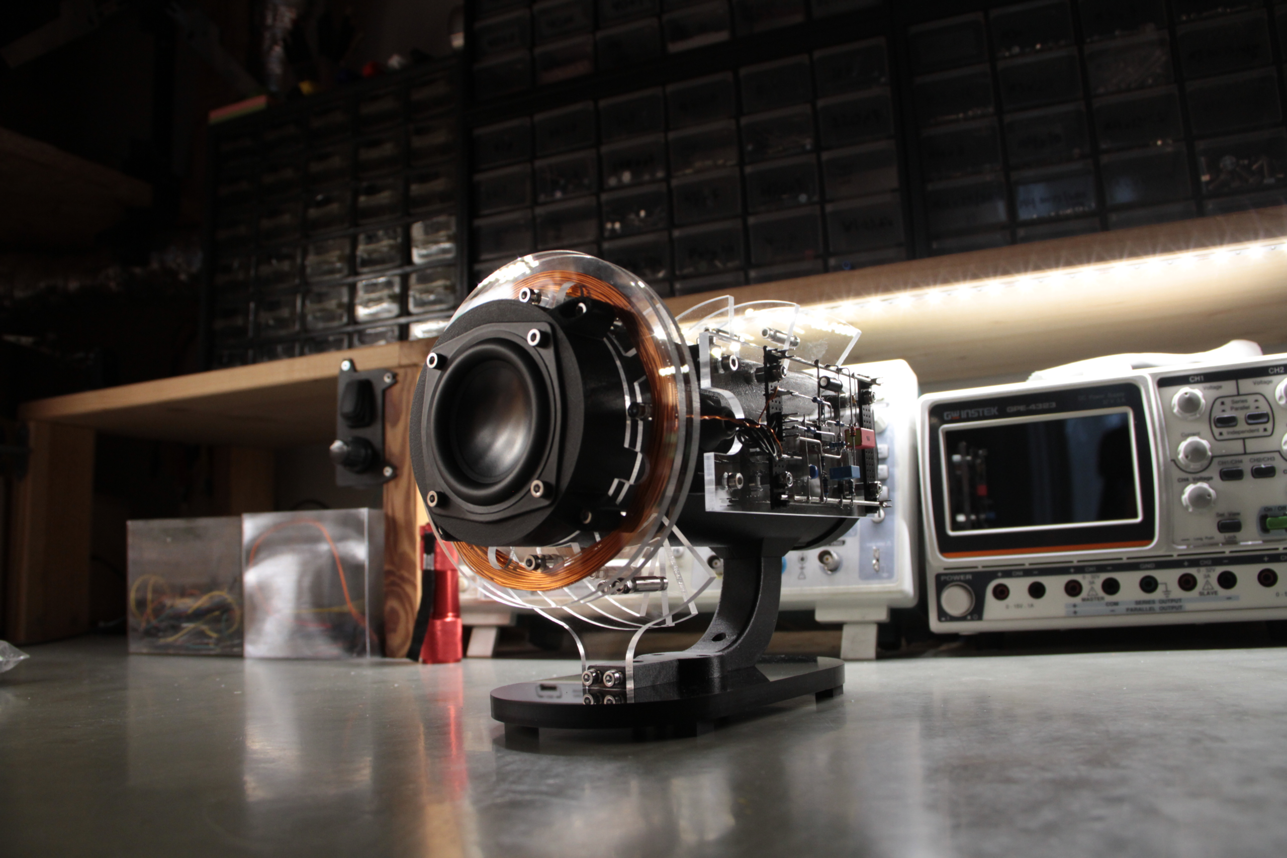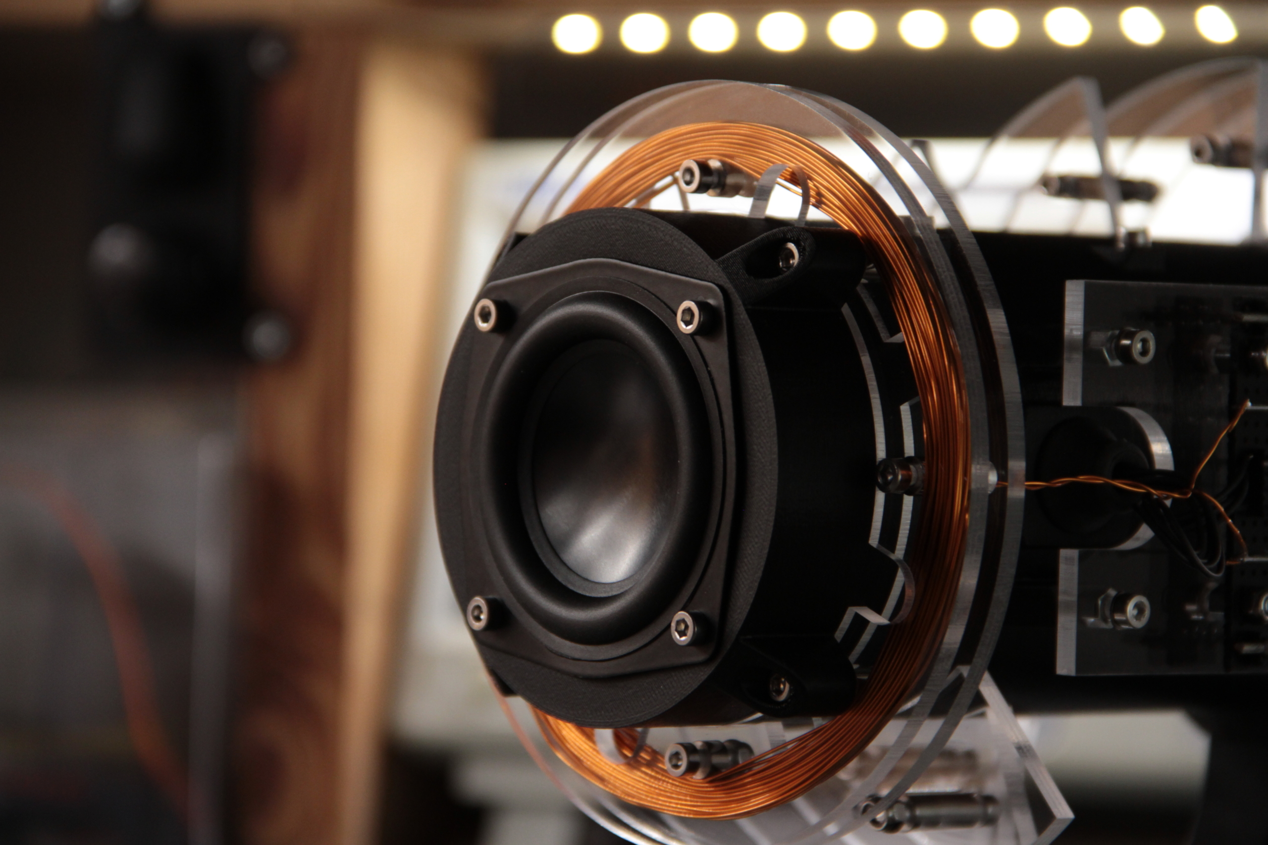 auburn scour is an electromagnetic sound and light sculpture, featuring a copper coil wrapped around a loudspeaker, picking up variations in the magnetic field of the driver and feeding it back into the audio signal. The compositional algorithm is based upon two generative rhythmical sequencers; one for the main melodic voice, and the other to chop the electromagnetic signal into musical, rhythmic pulses. An additional four-voice chord generator creates a backdrop of sparse, harmonic sweeps dependent on the notes produced by the main voice.