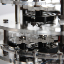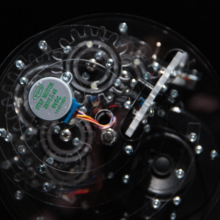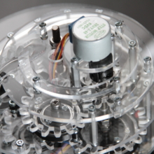 intermittent luminal phase is an electronic sound and light sculpture with two stepper motors and eight gears with various cog counts. Most gears are equipped with LEDs, which on account of the different gear ratios go through cyclical patterns at different speeds. A piezo element captures the vibrations and abrasions between the gears, and the resulting signal is amplified and blended with the natural acoustic soundscape of the sculpture.