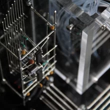 Carrying the customer’s logo — a variation on the ‘space invader’ — limbed fields is a hybrid sound and light sculpture featuring two analog and three digital voices, based respectively on the 33xx analog chip family and the Daisy Seed platform. It has two distinct modes — one harmonic and one rhythmical — which can be selected prior to booting up the circuitry. Additionally, the sculpture includes two channels of RGB light pipes which mirror the amplitude of the two analog voices, alongside two sets of white LEDs mounted on either side of the structure, tracing the sequencer patterns that drive the algorithmic composition. While fitted with a solitary speaker and passive radiator setup, the sculpture also provides two line outputs for stereo playback.