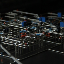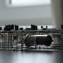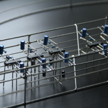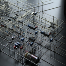 The sculpture derives its visual form from basic geometric shapes, intersecting and overlapping, reminiscent of suprematist art from the modernist era. The purpose of the freeform circuit construction style is two-fold, namely to highlight the intrinsic beauty of electronic components and the circuits they comprise, and to increase the transparency of the interal processes of the circuit. The first point is in no need of further explanation, but overlaps with the second regarding layout and mechanical support: the sculpture is built with functionalist principles in mind, and thus each component and wire has a specific role contributing to the structural integrity and overall purpose of the circuit – which becomes apparent should one follow each wire from its source to its destination. The design is therefore to an extent a result of function, not form. The essence of the second point about transparency could also easily be overlooked due to being so closely intertwined with what the sculpture is perceived to be actually doing, which is to create visual and auditory clues directly tied to its decision-making process. One could regard each burst of light and sound as a result of this process, but they really are real-time manifestations through sonification and visual feedback of the sculpture’s inner workings, and an attempt at communicating its processes as transparently as possible to an audience.