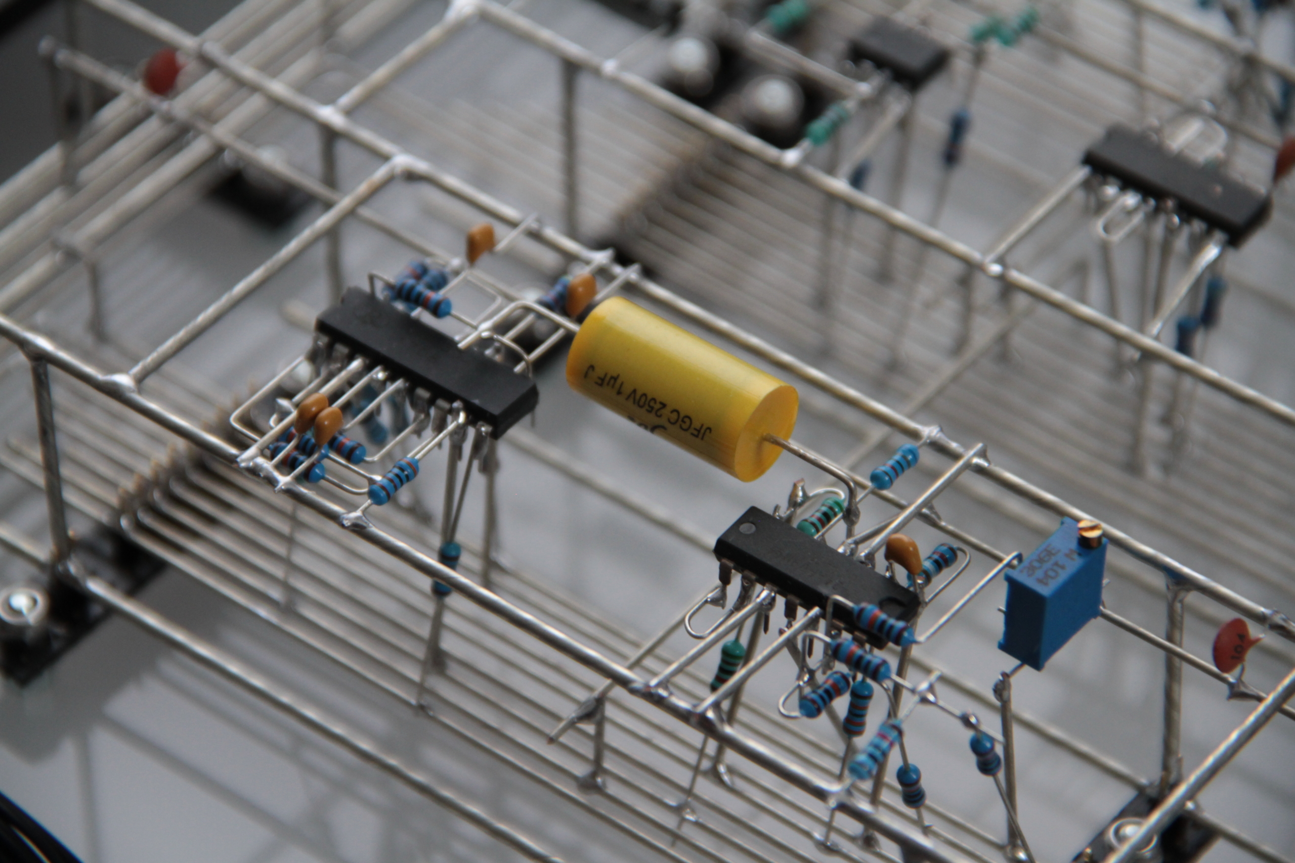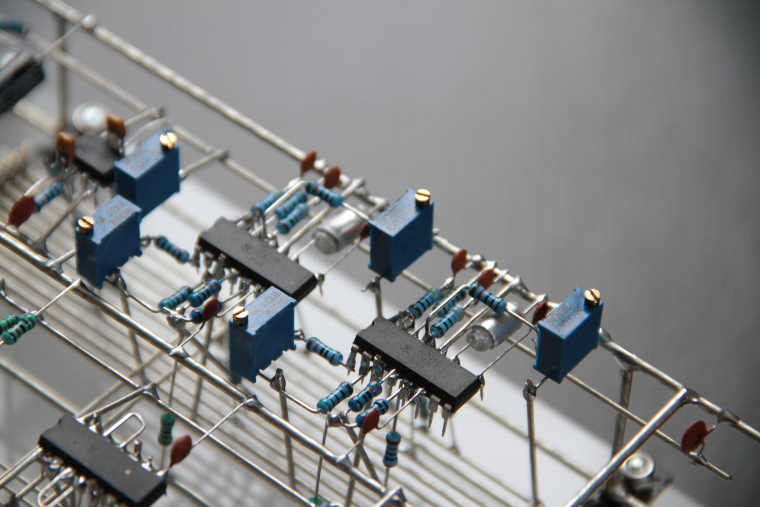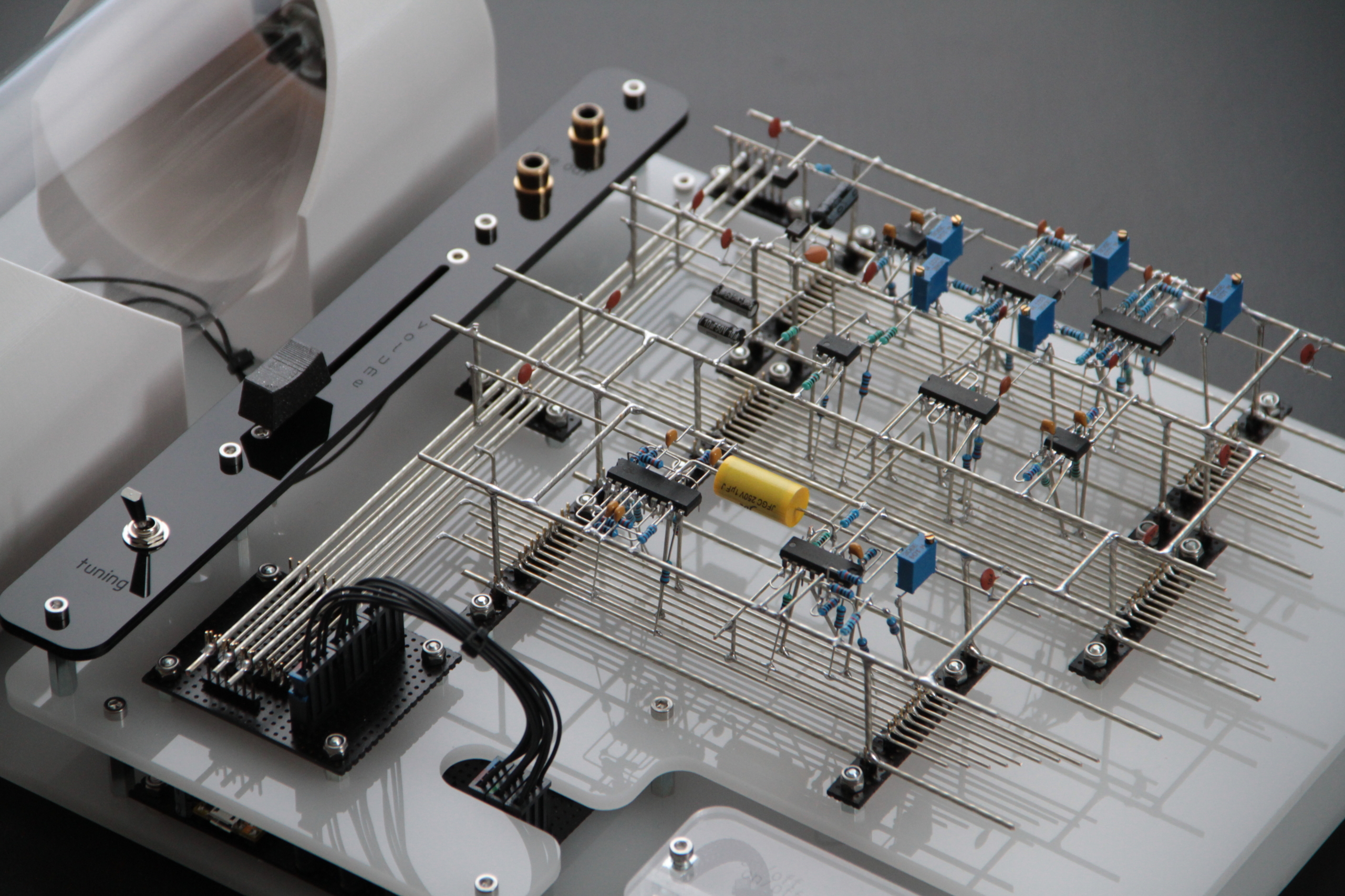 While at the tail-end of a design I had spent the previous month working on, I woke one morning with another, wildly different design coalescing in my inner eye. The other project was immediately dropped (though it might return), and after three days of design, worn limestone headlands is what came out of it. The code is a rewritten and optimized mix of shell-tethered vesper and pale relinquent, programmed onto a circuit board I had from the days of those projects (there’s no shame in reusing assets (I hope)). It consists of two analog and three digital voices, with ten loosely placed high-current LEDs sandwiched between two sheets of semi-translucent acrylic glass, randomly following the entries of each voice. It’s perhaps mildly ironic that I spent more time working on the title than on the actual design. The sculpture was initially intended to be wall-mounted, but later morphed into a freestanding piece. It still retains its 4.3 mm holes on each corner for wall-mounting, though.
